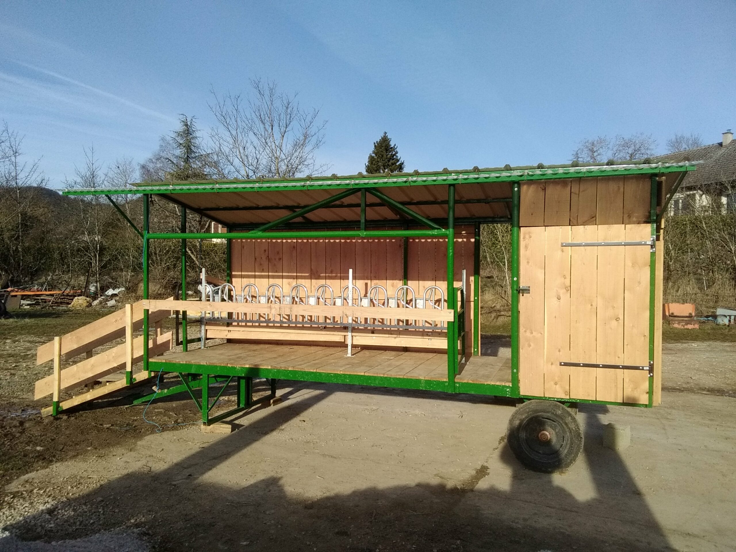 Le bâtiment étant situé en plein cœur du village, j’ai fait le choix d’un système plein air de mars à novembre afin d’éviter les aller-retours à la bergerie. La traite au pré s’est alors imposée comme la solution la plus pratique : je reprends l’ancien quai de traite utilisé par la famille Boillot pour les vaches que j’adapte pour brebis. Après une quinzaine d’année dans les broussailles, il méritait un petit coup de neuf !