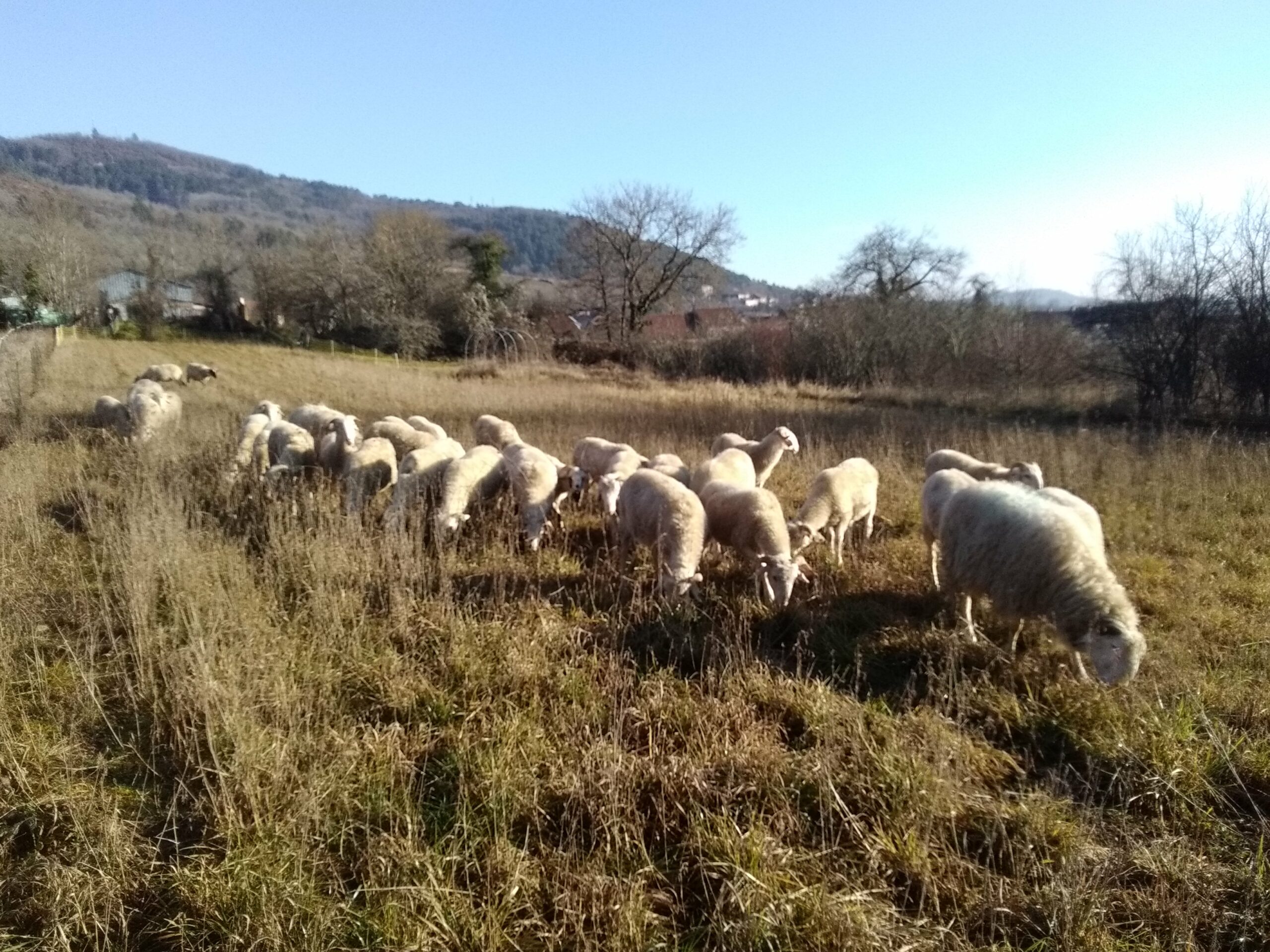 16 hectares de pré me sont loués en grande partie par le GFA Champs Libres. Cette surface permet d’assurer l’autonomie alimentaire du troupeau. Situés en coteaux, ce sont d’anciens vergers abandonnés qui ne pourraient être cultivés car trop pentus ou humides. Les brebis en font bel usage et se régalent des arbustes. J’en fauche une partie pour assurer l’alimentation hivernal, en bergerie, composée essentiellement de foin.