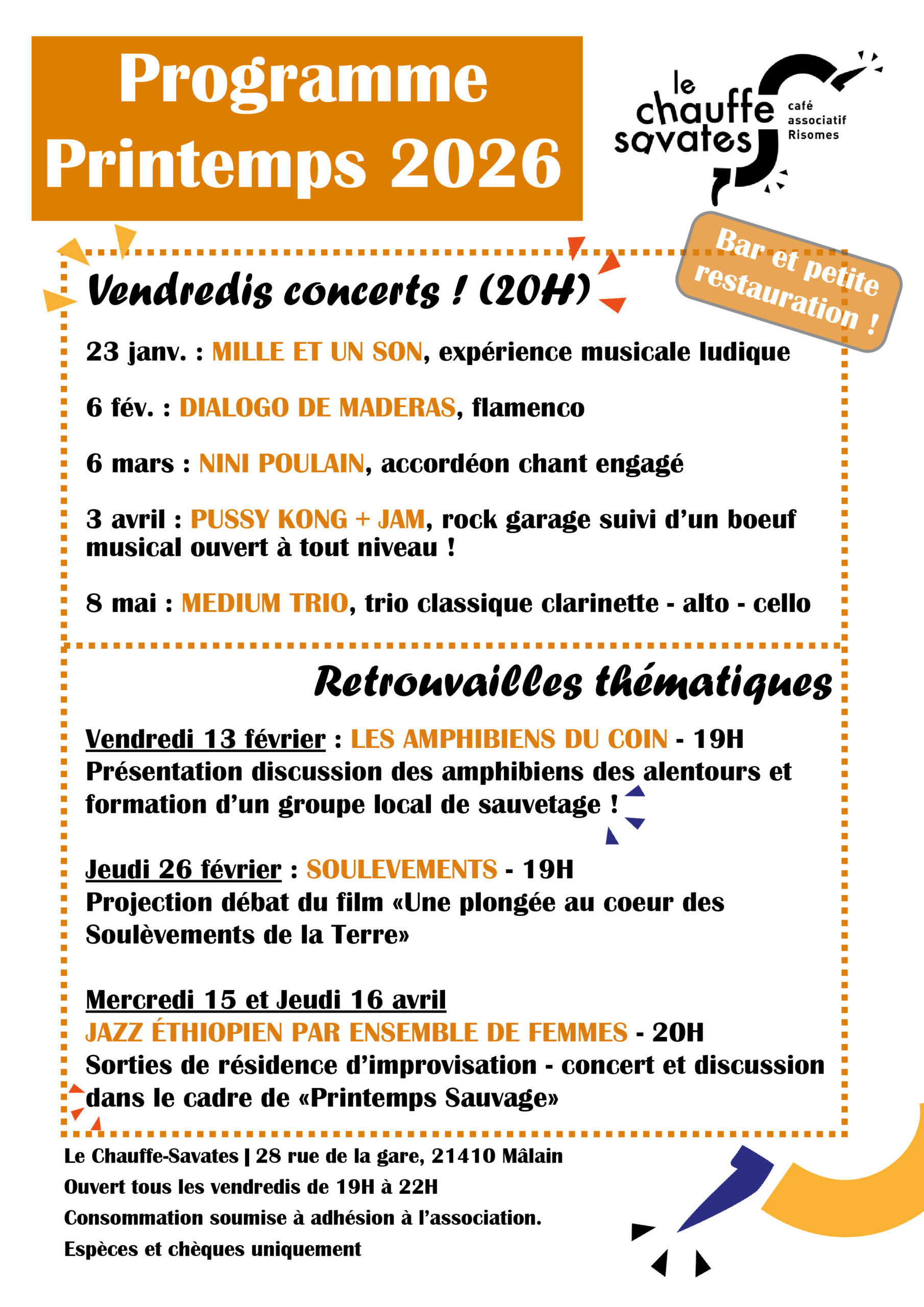 Le Chauffe Savates, café associatif de Mâlain, est un lieu ouvert à toutes et tous qui vise à concrétiser l’objet social de l’association RISOMES. Il est ouvert tous les vendredis soirs et utilisable à tout autre moment de la semaine. Pour les personnes ou structures extérieures, une convention de mise à disposition doit être signée. Chaque utilisateur du lieu s’engage à respecter son règlement intérieur.