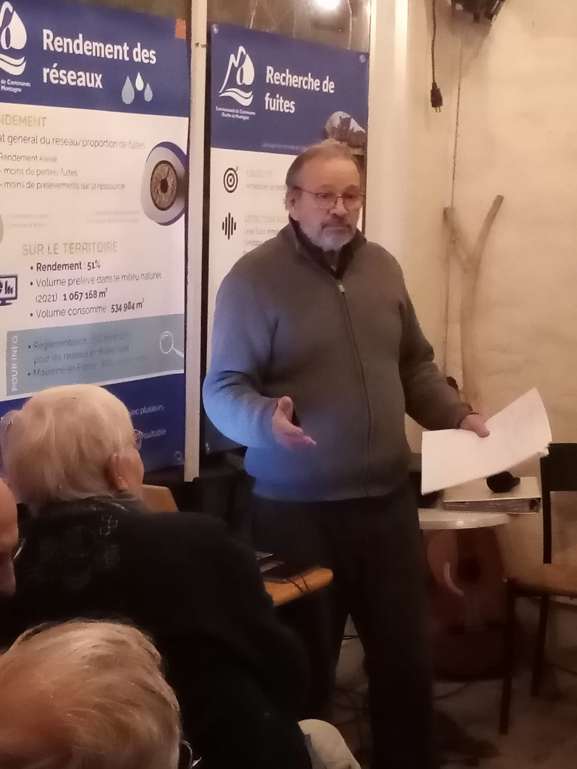 Présentations et échanges passionnants qui ont révélé la complexité des enjeux autour de l’eau : de la nécessité d’économiser et de préserver la ressource et les milieux jusqu’à la gestion de l’adduction en eau potable. Un bilan de la mise en place de la régie publique eau et assainissement Ouche et Montagne a été fait. Le travail est remarquable et nous pouvons féliciter élus et techniciens qui en ont la responsabilité. La reprise en main du réseau a révélé des surprises, notamment sur la vétusté des installations et le faible rendement du réseau (environ 51%). Merci Suez … Une « chasse aux fuites » a été engagée et un plan pluriannuel de renouvellement du réseau est en cours d’élaboration. Une chose est certaine, le retour à la régie publique marque un changement de logique : c’est désormais le long terme et l’intérêt général qui priment et non la recherche de profit dans une logique commerciale. La gestion est désormais transparente et c’est tout un savoir-faire qui est train d’être regagné.